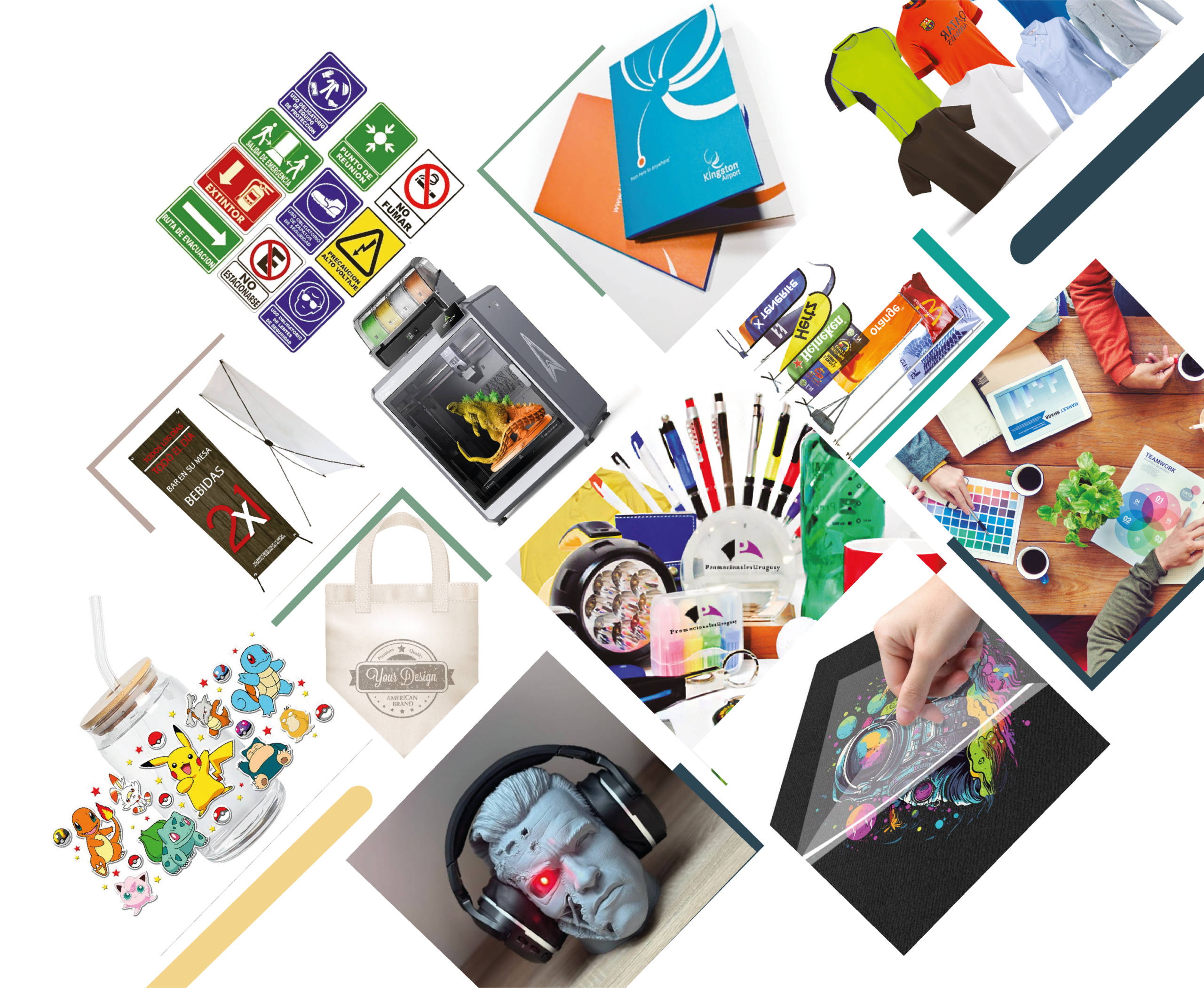 Diseñamos y fabricamos productos 100% personalizados en textiles (uniformes, playeras, bolsas,banderas, etc), impresos (empaques, etiquetas, libretas, folletos, banners,rígidos, señalización, etc. ) rotulación (autos, oficinas, paredes) y plásticos (vasos, usb, pulseras, etc.); con base a los requerimientos de tu proyecto.
